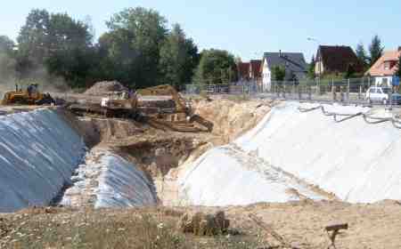 Im April 2004 sind die Arbeiten fortgeschritten. Die Trasse wird vorbereitet. Blick vom Zehnruthenweg Fahrtrichtung Berlin. Im Hintergrund der Damm der Anhalter Bahn.
