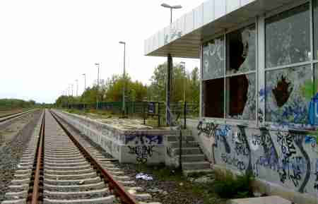 Auf den beiden Seitenbahnsteigen des 4-gleisigen Bahnhofes wuchert das Unkraut.